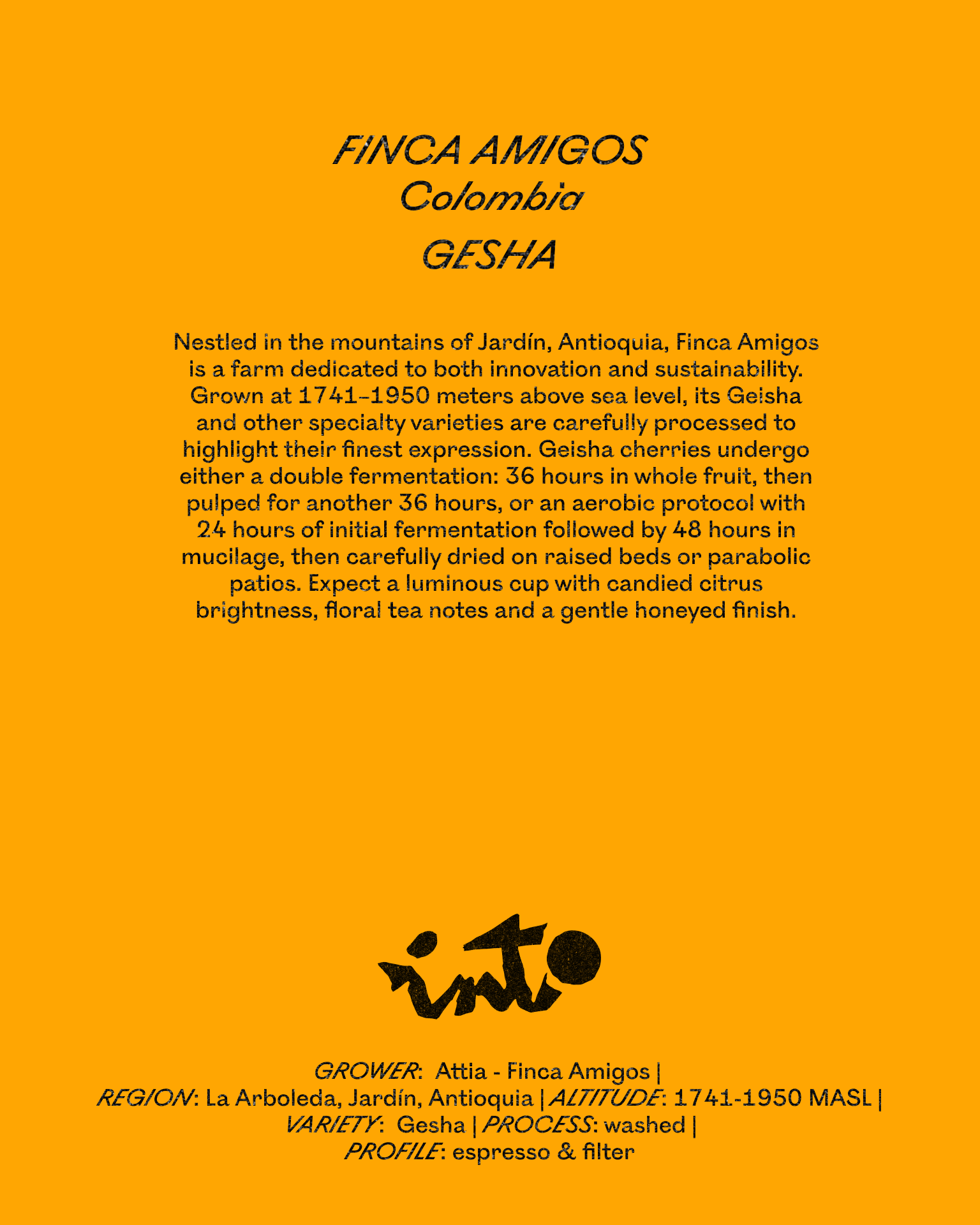 Nestled in the mountains of Jardín, Antioquia, Finca Amigos is a farm committed to both innovation and sustainability. Cultivated at 1741–1950 meters above sea level, its Geisha and other specialty varieties are carefully processed to highlight their most expressive qualities. Geisha cherries undergo either a double fermentation, 36 hours as whole fruit, then pulped for another 36 hours, or an aerobic protocol with 24 hours of initial fermentation followed by 48 hours in mucilage, before being meticulously dried on raised beds or parabolic patios.