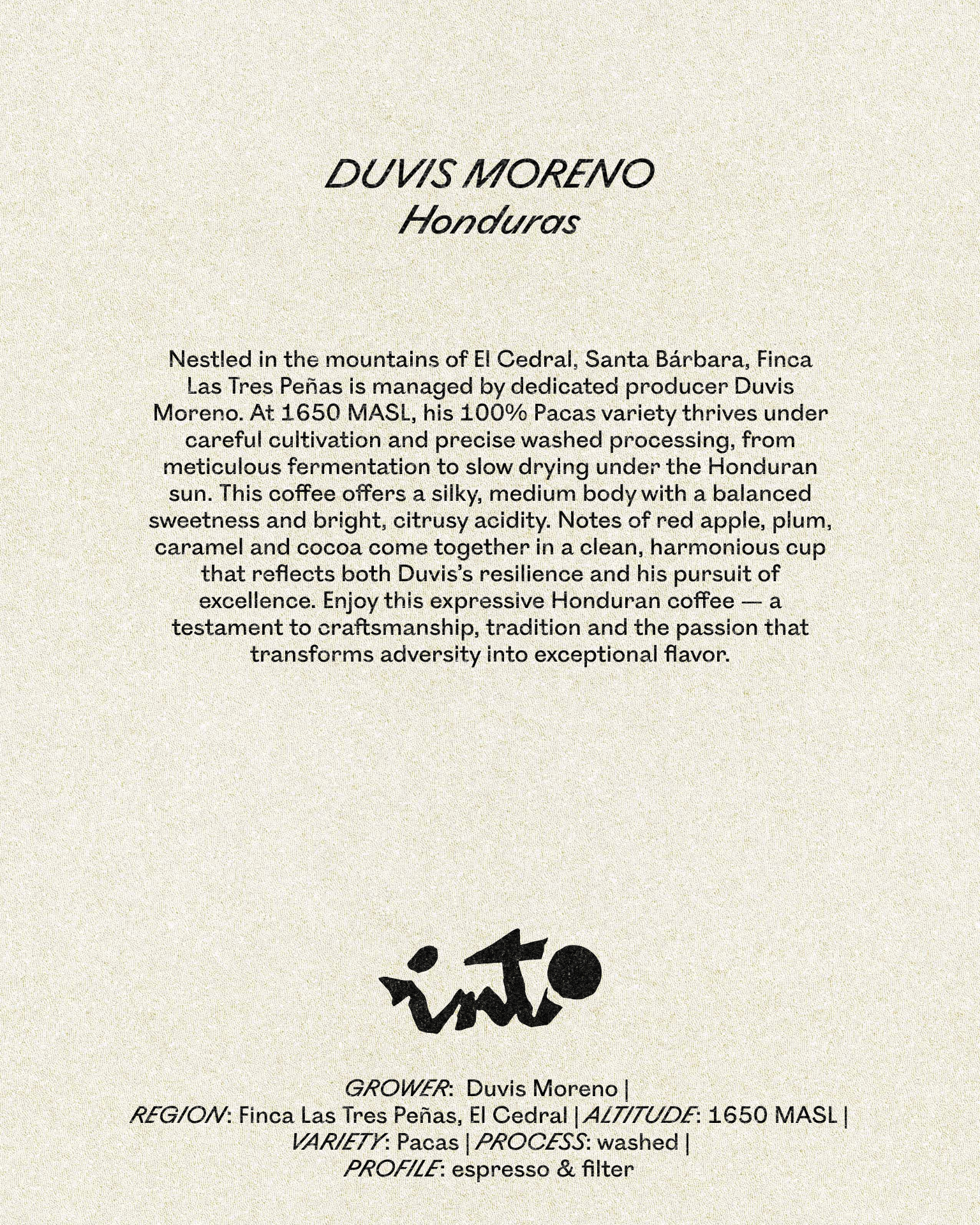 This coffee offers a silky, medium body with a balanced sweetness and bright, citrusy acidity. Notes of red apple, plum, caramel and cocoa come together in a clean, harmonious cup that reflects both Duvis’s resilience and his pursuit of excellence. Enjoy this expressive Honduran coffee — a testament to craftsmanship, tradition and the passion that transforms adversity into exceptional flavor.